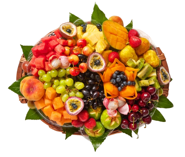 סלסלה המכילה מגוון רחב של פירות טריים בהתאם לעונה, פירות אקזוטיים ומיני מזלגונים.