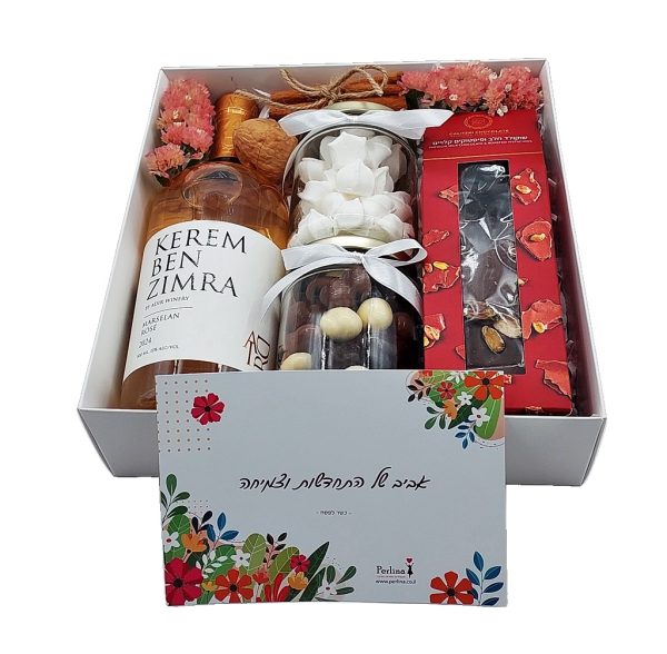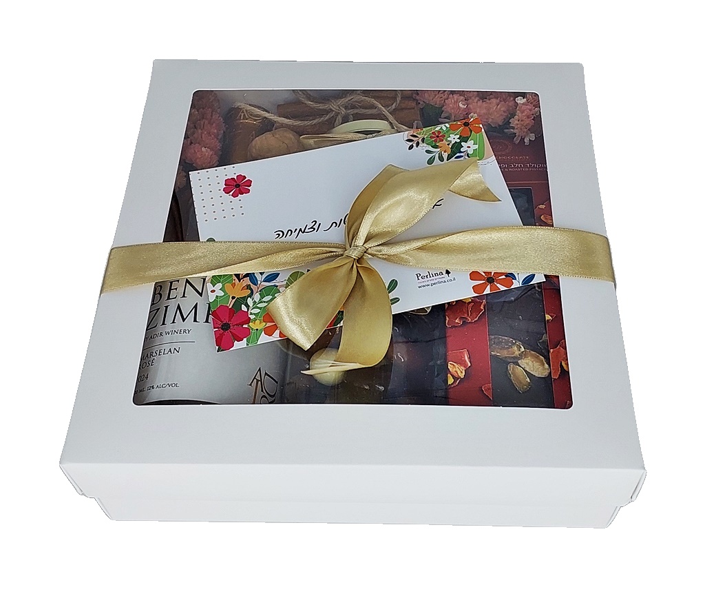 אריזה: קופסת קרטון, סרט חגיגי, גלויה לחג ושקית נשיאה מהודרת