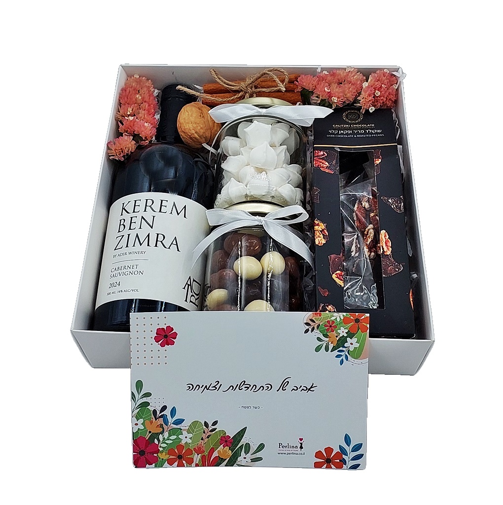 מארז מתנה לפסח בקופסה, המשלב יין ומבחר מתוקים מפנקים.