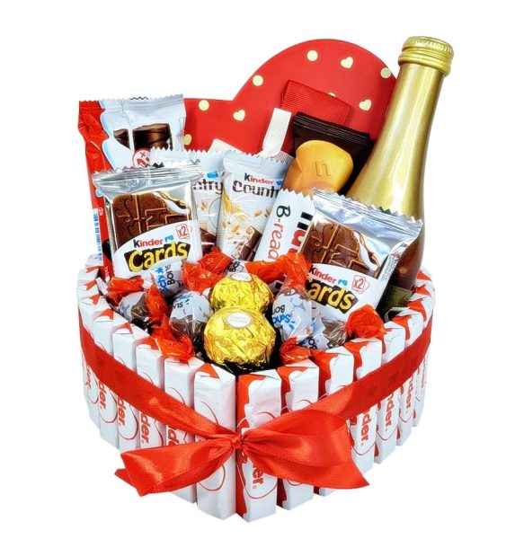 מבחר רחב של מוצרי שוקולד ‘קינדר’ האהובים, ‘פררו רושה’ ובקבוק ‘בלו נאן’.