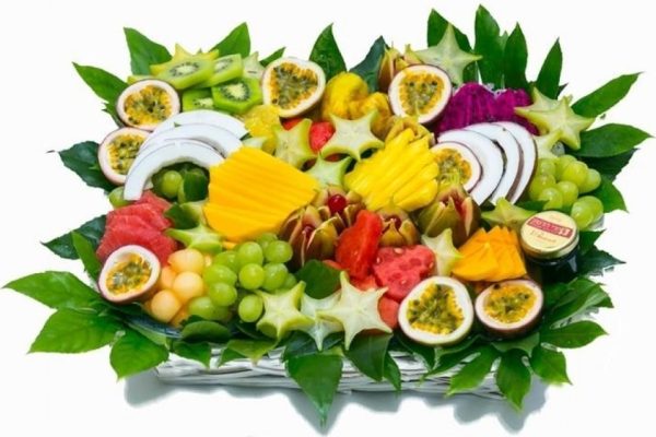 סלסלה המלאה במבחר גדול של פירות החתוכים ומעוצבים בקפידה.